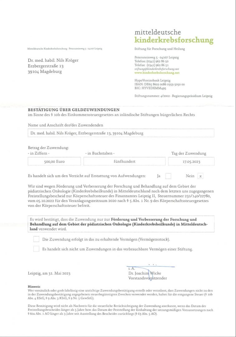 Seit ca. einem Jahr sammeln wir für Befundkopien und Ausdrucke von Ihnen freiwillige Spendenbeiträge. Die erste Auswertung hat ergeben, dass so im Laufe der Zeit ein Betrag von 309,00€ gespendet wurden. Diesen Betrag hat unsere Praxis auf 500 € aufgerundet und als Spende an die Mitteldeutsche Kinderkrebsforschung übergeben.
